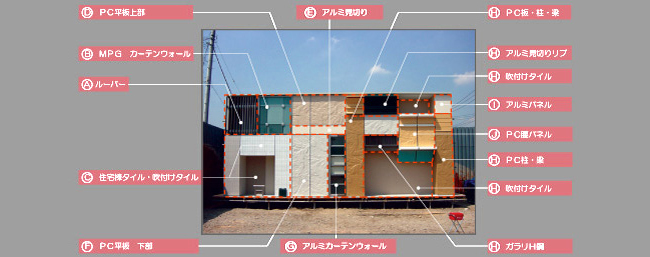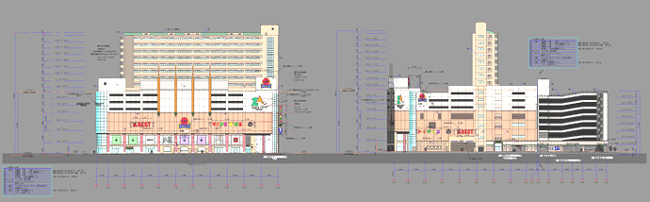 Architecture外装・外構計画の実例 【outsidea vertical plane】建物外観に個性を与える色彩、素材の選定を視覚化。同時に各大型サインの配置も計画する。