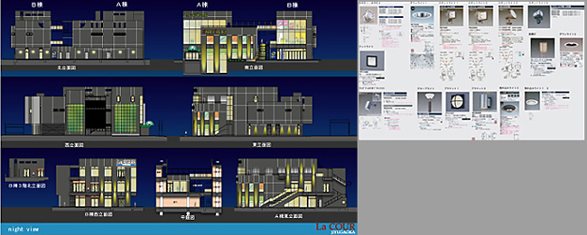 机上の検討から離れ実際の大きさや質感、自然光での色彩などを建築現場付近に再現し検討を行う。 ライトアップ計画の実例 【night view plane】外部照明は外壁への電源供給が必要となるため計画は比較的早い段階になる。