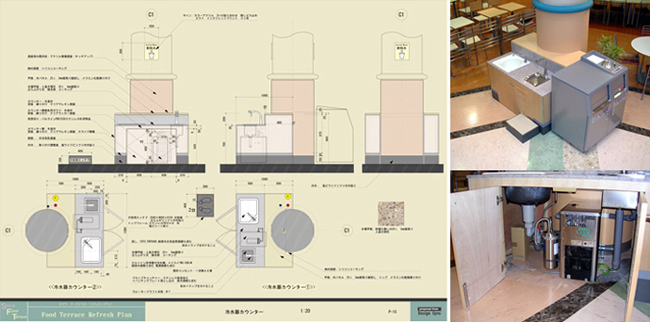 事例はショッピングセンターフードコートの飲料水サービスカウンターの図。写真右上は竣工したカウンター。 写真右下はカウンター内の冷飲料水装置。水道直結型で浄化した水を瞬間冷却する。衛生面からも一般的になりつつある。 その他インテリアに関わる業務 【other】パース・スケッチの制作