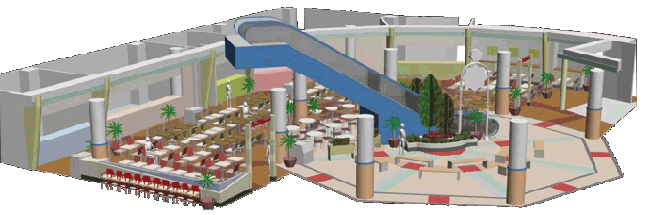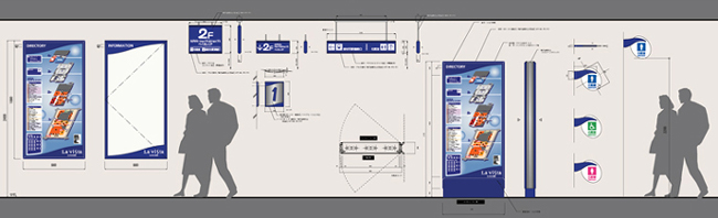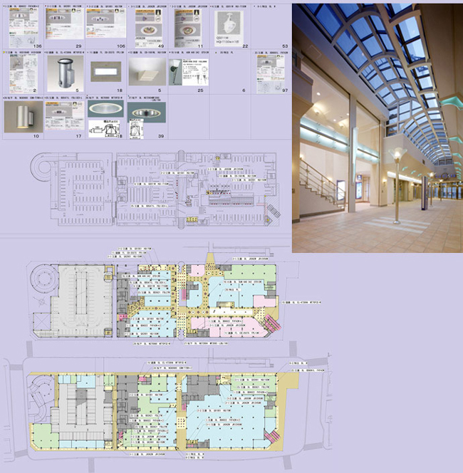 各フロアの業種業態にあわせ照明器具配灯計画をする。基本照明の照度分布を確認し、さらに演出照明を組み込む。 特に天井面や造作鉛直面も明るくなるような配置が必要である。 また、管球の交換等メンテナンスのしやすさを配慮することが大事である。 昨今は演出部分以外にも長寿命の高輝度LEDの利用が多く見られる。 モールの個性化を図るためオリジナルの照明器具が必要となる場合がある。 右上写真はオリジナルの照明器具ポール灯、ブラケット照明、壁面造作照明の4点をデザインした。 サインシステム計画の実例 【sign system plane】